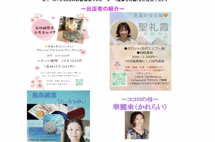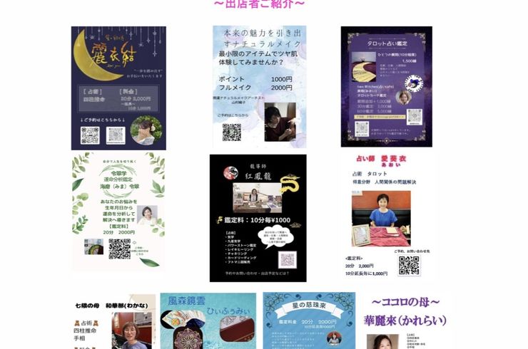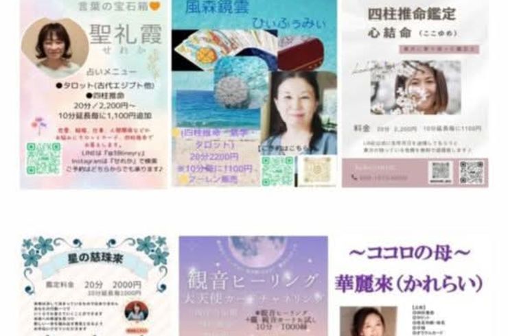 「占い」をはじめ「アロマタッチ」や「古代文字氣功」にてひとりひとりに合ったヒーリングを行っています。